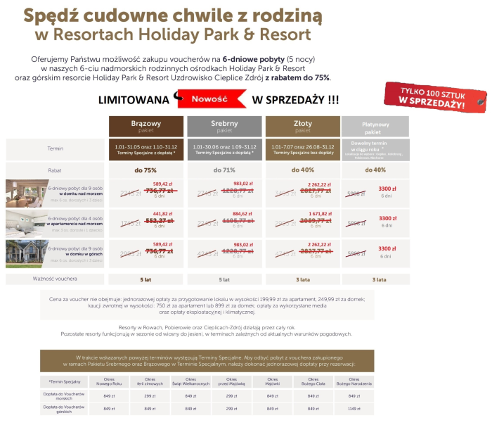Możecie Państwo dokonać zakupu voucherów na 6-dniowe pobyty (5 nocy) w 6-ciu nadmorskich rodzinnych ośrodkach (Rowy, Pobierowo, Mielno, Ustronie Morskie, Niechorze, Grzybowo) oraz górskim resorcie Holiday Park & Resort Uzdrowisko Cieplice Zdrój z JESZCZE WIEKSZYM RABATEM!